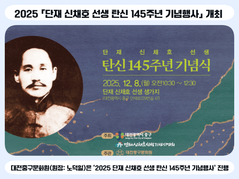 대전중구문화원(원장: 노덕일)은 ‘2025 단재 신채호 선생 탄신 145주년 기념행사’를 12월 08일 오전 10시 30분부터 대전광역시 중구 어남동 도리미마을 단재선생 생가지에서 진행한다.