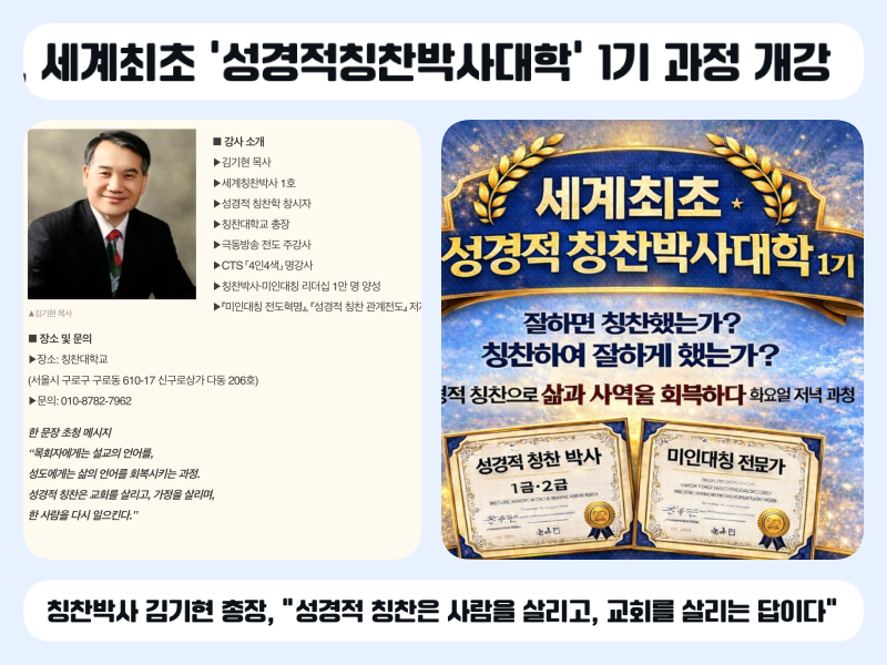 기독교 2000년 역사 속에서 성경적 칭찬을 하나의 신학·사역·교육 체계로 정립한 세계 최초의 교육과정인 ‘성경적칭찬박사대학’ 1기 과정이 오늘 2월 3일(화) 개설된다.
