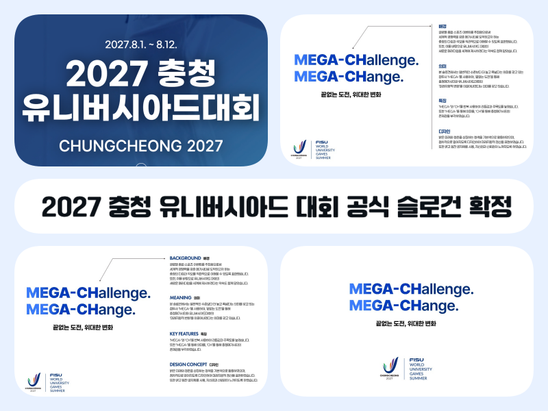 2027 충청 유니버시아드대회 조직위원회(위원장 강창희, 이하 ‘조직위’)는 대국민 선호도 조사를 거쳐 공식 슬로건을 ‘Mega-Challenge Mega-Change’로 최종 확정했다고 밝혔다.