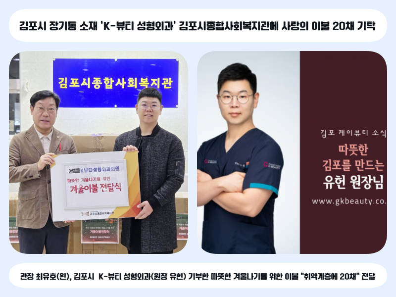 김포시종합사회복지관 최유호 관장은 “평소 지역사회 소상공인과 이웃을 위해 꾸준히 따뜻함을 전해주시는 K-뷰티 성형외과에 깊이 감사드린다”며, “전해주신 이불은 후원자의 따뜻한 마음을 담아 꼭 필요한 이웃들에게 잘 전달하겠다”고 말했다.