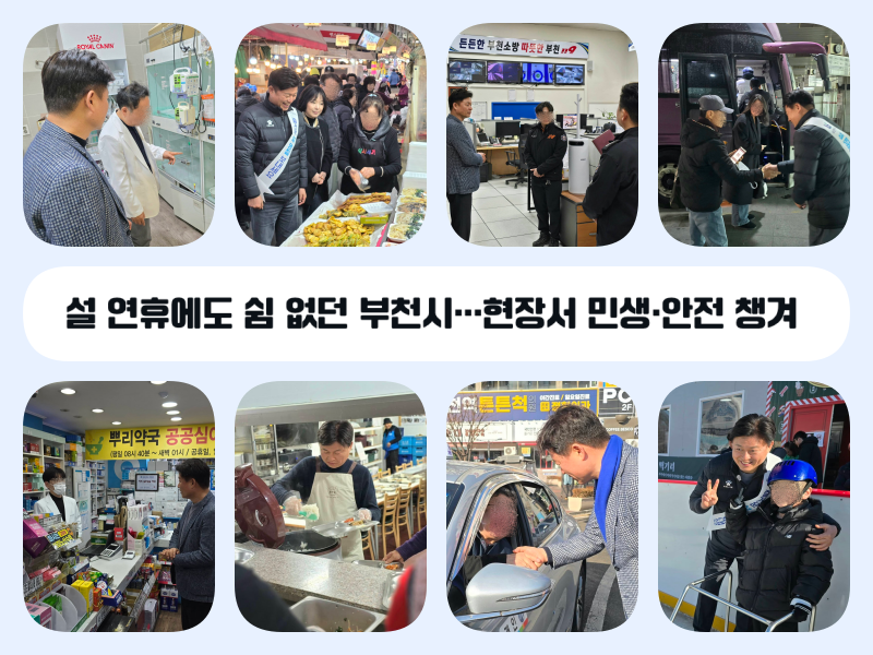 조용익 부천시장은 “명절에도 도시 곳곳을 지키는 분들이 계시기에 부천시민의 편안한 일상이 멈추지 않을 수 있었다”며 “연휴가 끝난 뒤에도 민생 회복과 안전한 일상을 위해 현장에서 답을 찾는 시정을 흔들림 없이 이어가겠다”고 말했다.