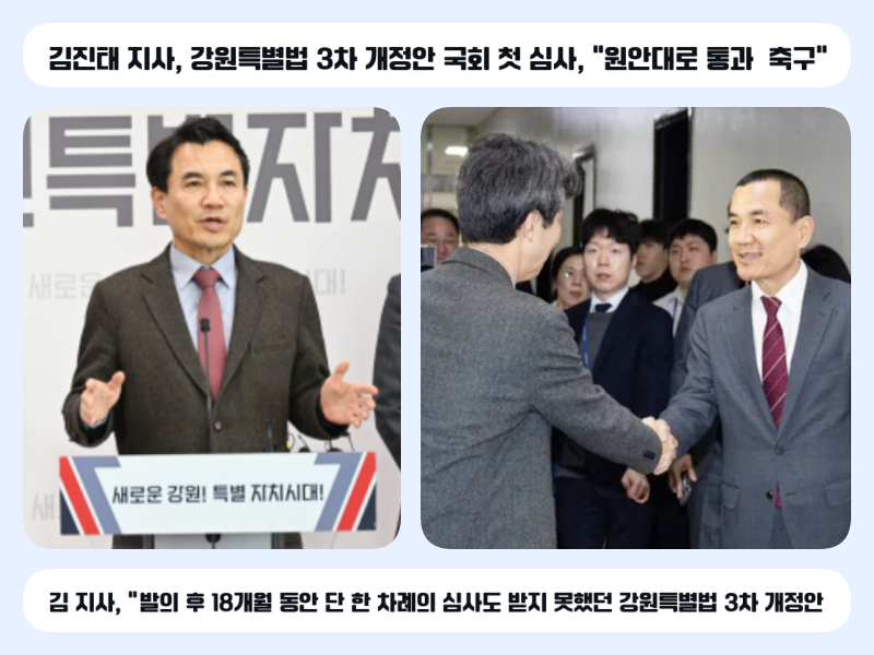 김 지사는 이날 발표한 성명에서 “발의 후 18개월 동안 단 한 차례의 심사도 받지 못했던 강원특별법 3차 개정안이 오늘 처음으로 국회 심사를 받게 됐다”며 “늦게나마 **대한민국 국회 행정안전위원회 소위원회에 상정된 것을 다행으로 생각하지만 조속한 처리와 원안 통과가 필요하다”고 밝혔다.