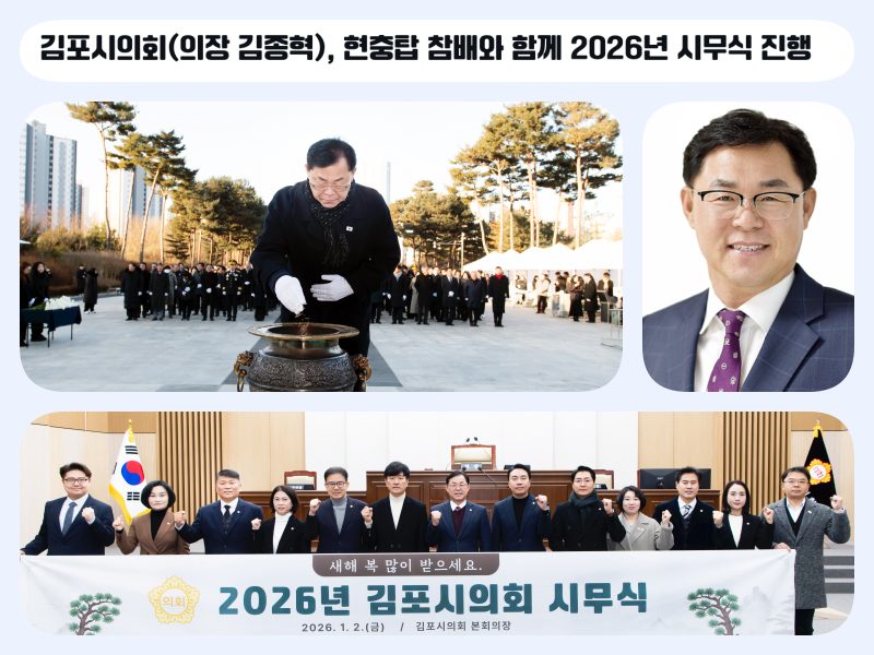 이날 김종혁 의장을 비롯한 시의원들은 김포 현충탑을 찾아 순국선열과 호국영령에 대한 깊은 경의를 표하고, 헌화와 분향을 진행했다. 이어 시의회 본회의장에서 열린 시무식은 국민의례, 임용장 수여, 의원 윤리강령 및 윤리실천규범 낭독, 신년사 낭독 순으로 진행됐으며, 시의원과 의회사무국 직원 등 50여 명이 참석해 새해 의정활동의 시작을 함께했다.