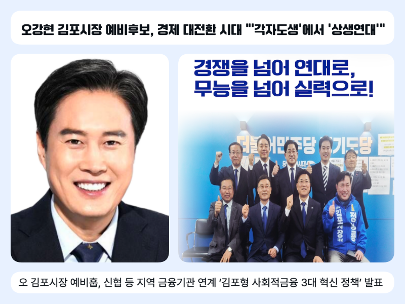 오 후보는 23일 발표한 정책 성명을 통해 “고금리·고물가의 위기 속에서 ‘각자도생’식 경쟁은 한계에 다다랐다”며, “이제는 협동과 연대에 기반한 ‘상생연대’의 경제로 체질을 바꿔야 김포의 미래가 있다”고 강조했다.