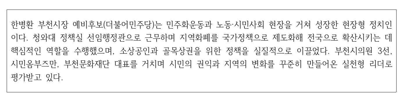 한편 한병환 예비후보는 청와대 선임행정관, 부천시의원, 부천문화재단 대표이사 등을 지낸 행정·정책 전문가로, 최근 부천 주요 현안을 놓고 현장 중심의 정책 행보를 이어가고 있다.