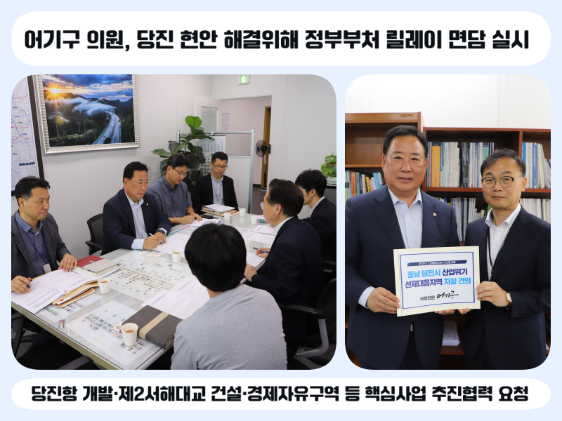 - 당진항 개발·제2서해대교 건설·경제자유구역 등 핵심사업 추진협력 요청 - 철강클러스터 당진시 ‘산업위기 선제대응지역’ 지정 강력 건의 - 어 의원, “중앙정부와 긴밀히 협력해 당진 숙원사업 완수할 것” |