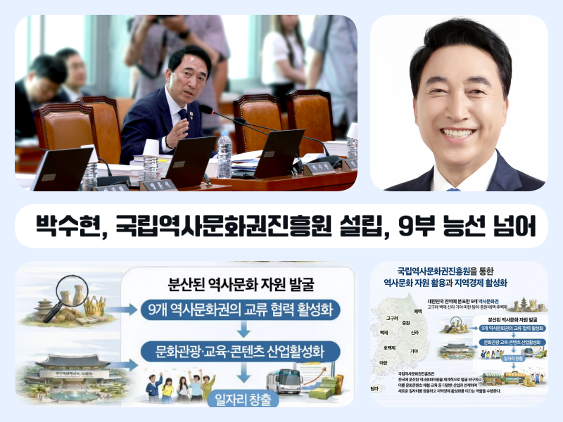 이에 박수현 의원은 우리나라에 지정된 9개 역사문화권의 조사·연구 성과를 국가 차원에서 통합하고, 체계적으로 활용하기 위한 <국립역사문화권진흥원> 설립 근거 마련을 위해 「역사문화권 정비 등에 관한 특별법」을 대표발의하고, 소관 상임위원회인 문화체육관광위원회 법안소위와 전체회의 만장일치 통과를 주도해왔다.