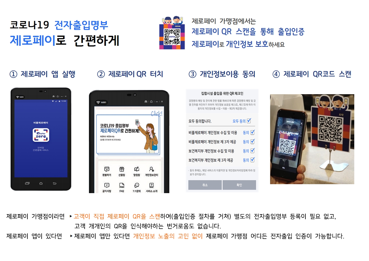 사업주가 별도로 출입인증을 위한 단말기를 설치하지 않아도 매장의 제로페이 QR코드를 스캔하면 자동으로 출입이 인증되는 방식입니다. 이렇게 수집된 개인정보는 확진자 발생시 역학조사에 활용되고 안전하게 관리한 후, 4주가 지나면 자동으로 폐기됩니다.